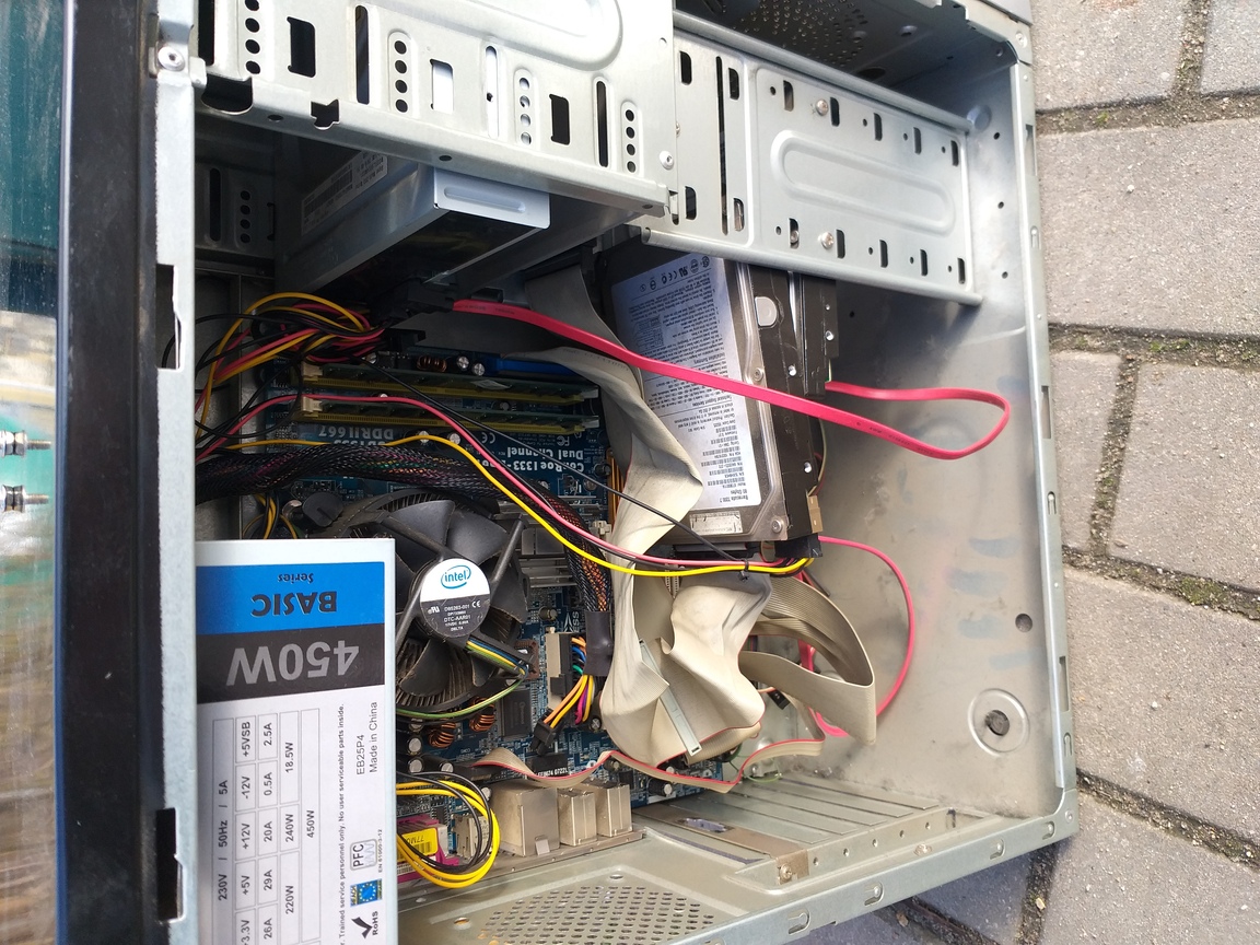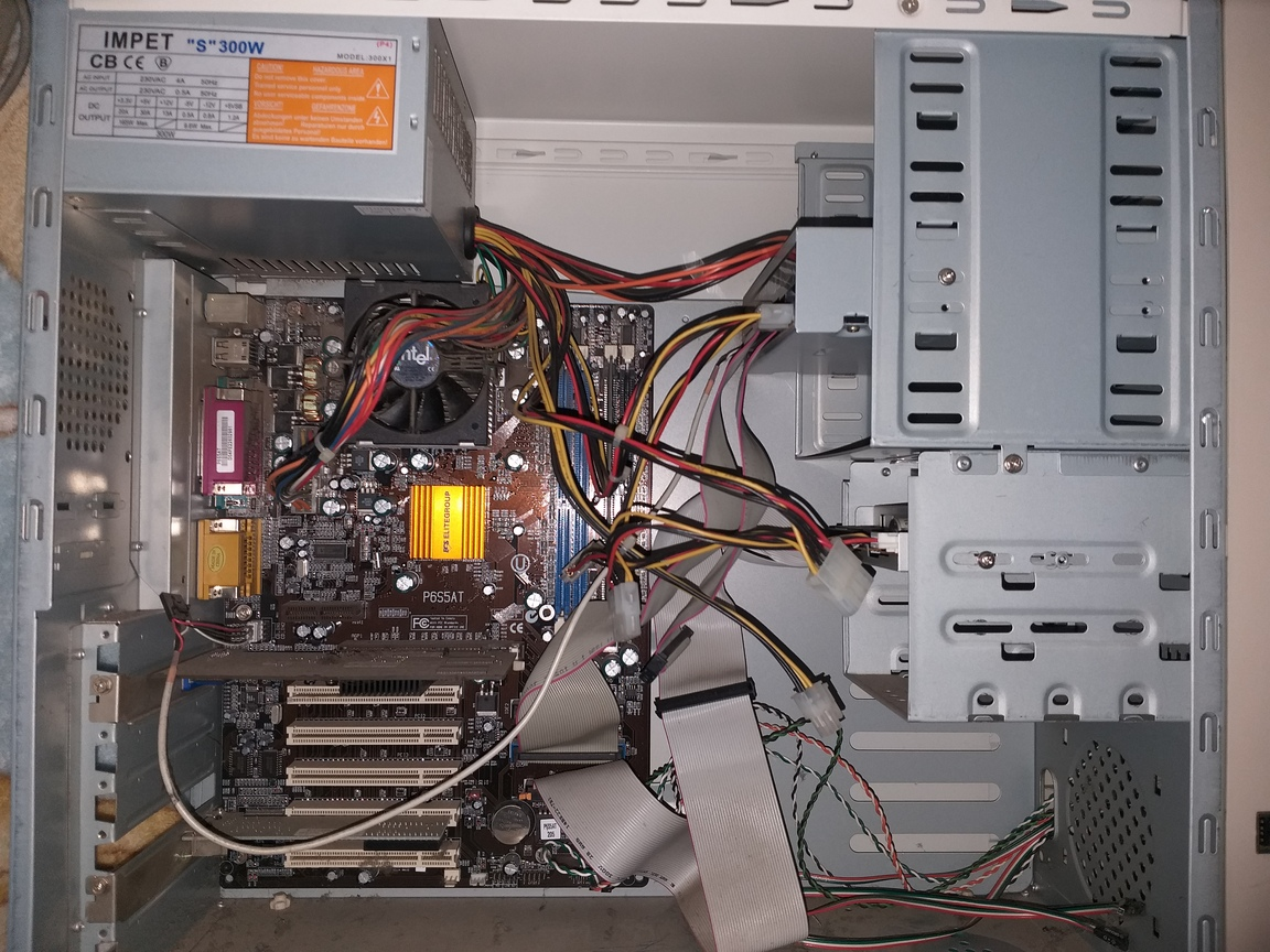 Komputer "z Sekretariatu firmy" - płyta prawdopodobnie ECS na 775, Celeron D lub jakiś P4, 1,5GB RAM DDR2, HDD 80GB + 40GB IDE (Maxtor DiamondMax Plus 8 i 10), DVD Samsung, FDD, zasilacz Deer z 2006, licencja XP Home