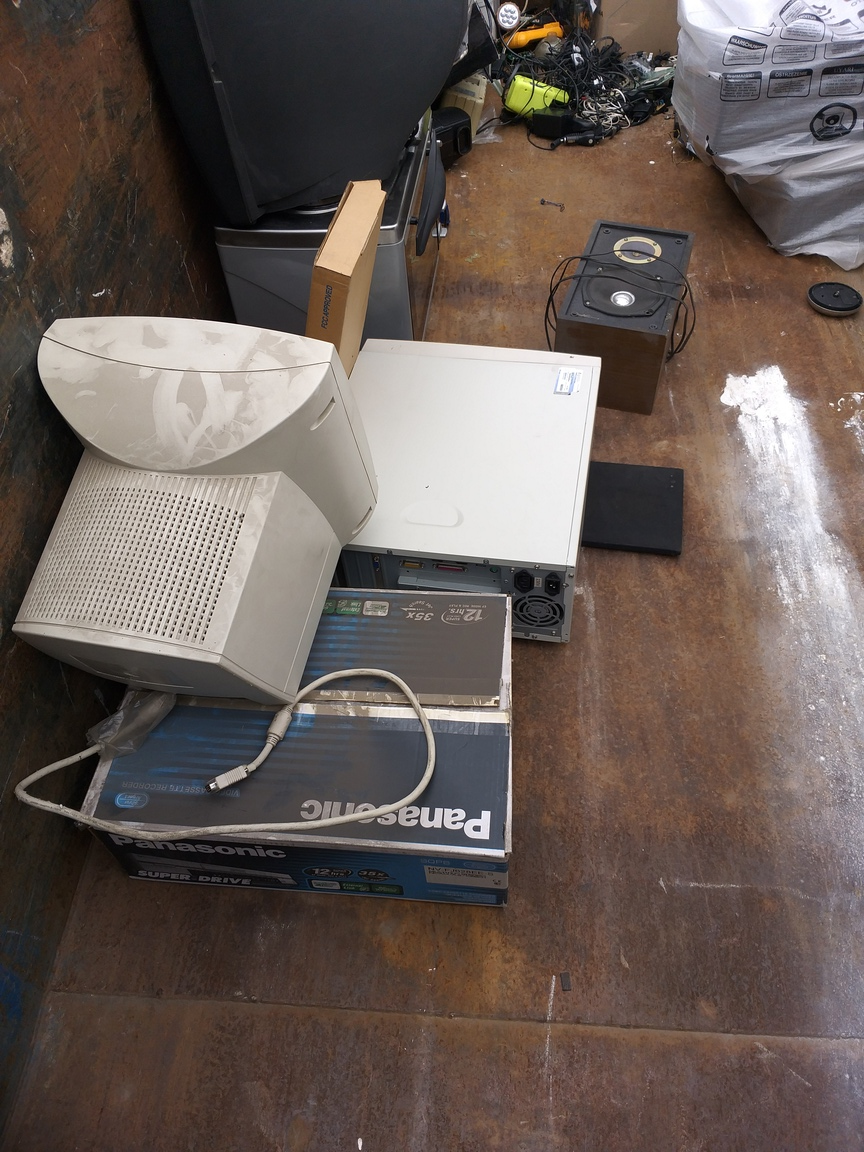 Komputer "z Sekretariatu firmy" - płyta prawdopodobnie ECS na 775, Celeron D lub jakiś P4, 1,5GB RAM DDR2, HDD 80GB + 40GB IDE (Maxtor DiamondMax Plus 8 i 10), DVD Samsung, FDD, zasilacz Deer z 2006, licencja XP Home
